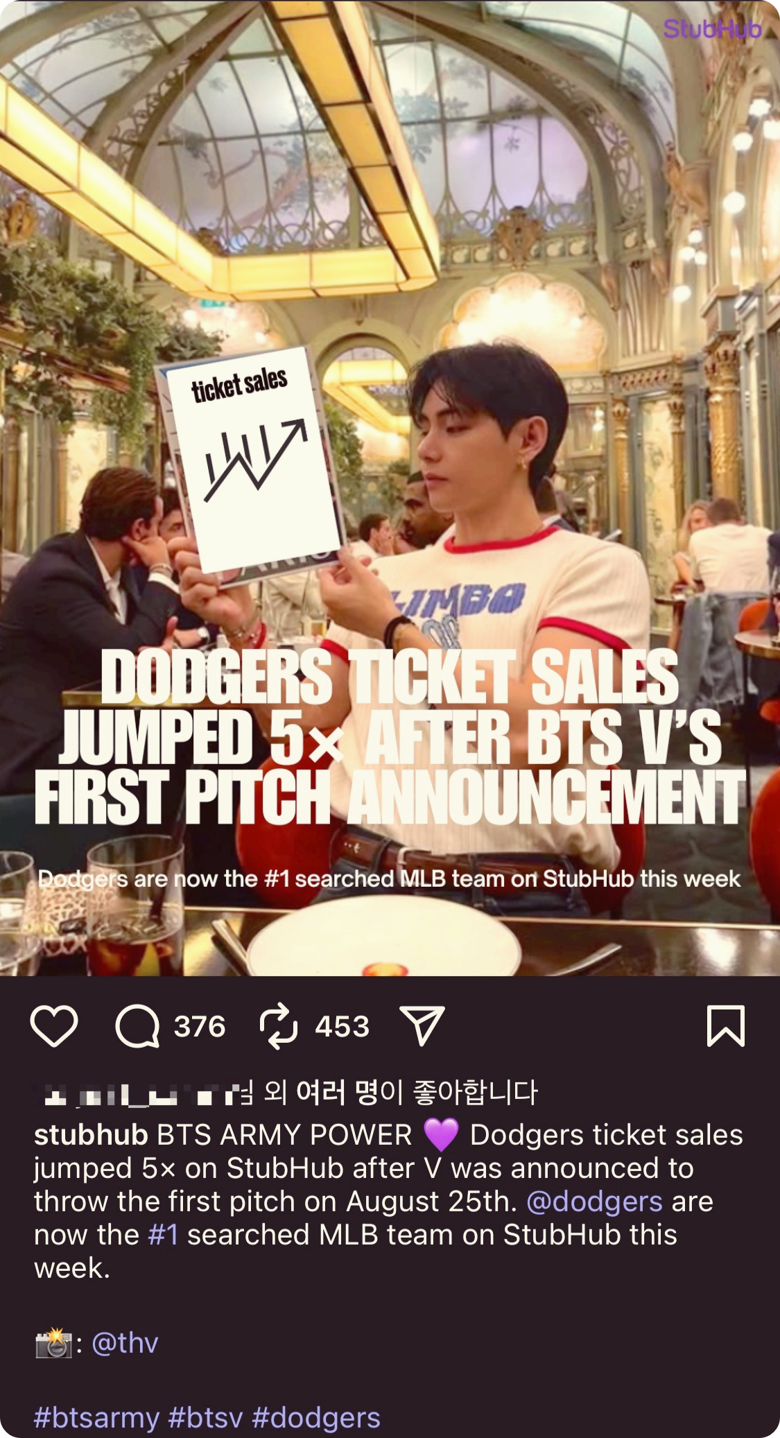 그러면서 뷔 사진과 함께 "8월 25일 다저스타디움에서 시구" 이렇게 발표했는데...